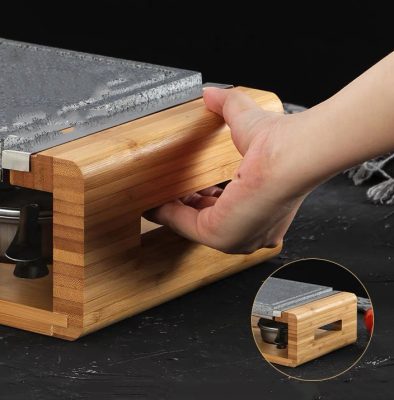 Chân đế được làm bằng gỗ hình chữ nhật, miếng đá được duy trì nhiệt độ bằng 2 hũ cồn