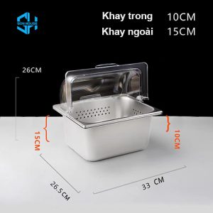 Khay inox 1/2 có ngăn đá giữ lạnh thức ăn, topping bánh mì thịt nguội, trái cây có nắp đậy kín bằng nhựa trong suốt