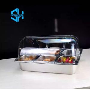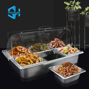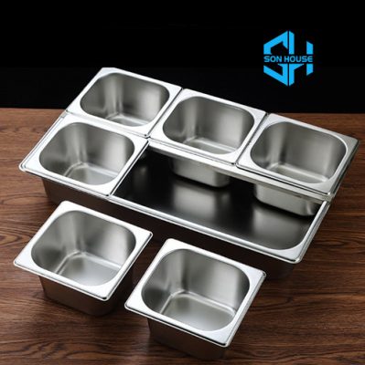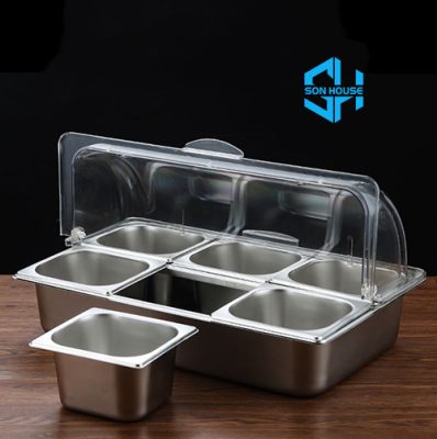 Thùng khay inox 6 ngăn đựng thực phẩm, topping trà sữa, trái cây ướp đá có nắp đậy trong suốt